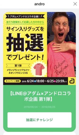 androにLINE登録して抽選でアダムとのコラボシャツもらえるそうですよヾ(≧▽≦)ノ
